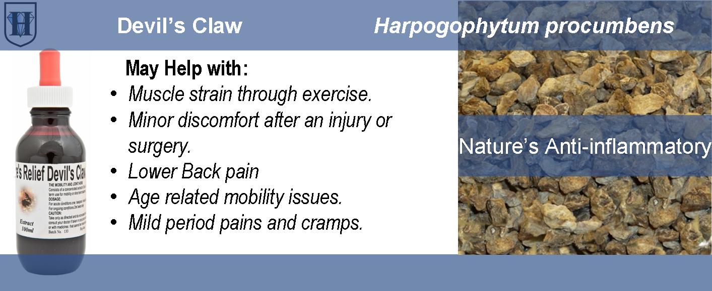 Harpogophytum procumbens. Helps lower blood pressure.Bitter principles act to stimulate liver, gall bladder and lower blood sugar. Devil’s Claw stimulates uterine muscles and should not be given to pregnant woman. Suitable for addressing mild tooth pain or a threatening abcess.