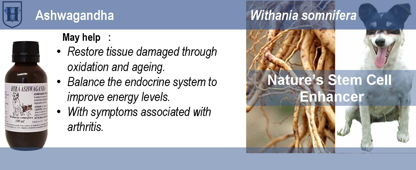 Withania somnifera. True rejuvenating herb. Particularly suitable for older pets with age related degenerative conditions and during times of physiological stress. An adaptogenic herb which can regulate important physiological processes ie damp down an over-active immune response and stimulate an under-active immune system. Sitoindosides found in the plant enhance pathogenic-destroying phagocytes. Ashwagandaholine has calming and anti-spasmodic properties.